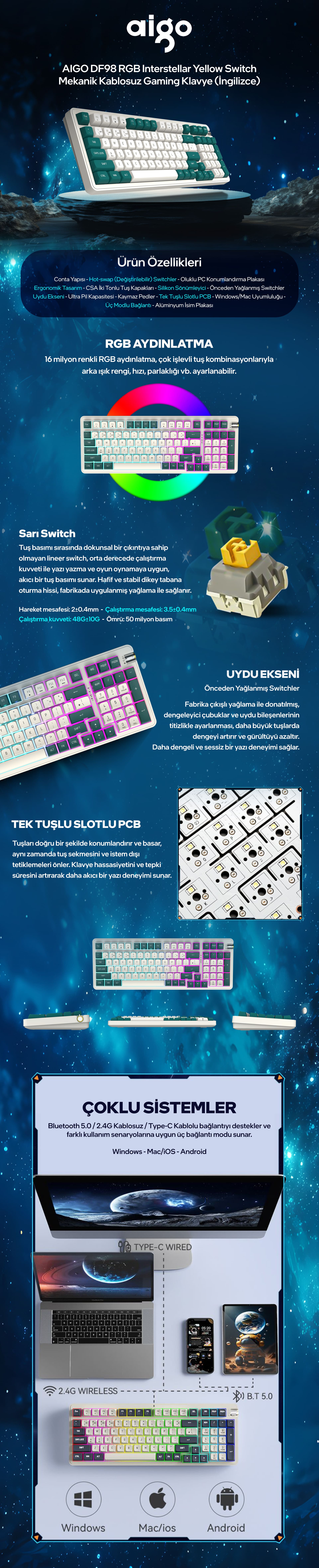 AIGO AG98 RGB Gri İngilizce Q Mekanik Sarı Switch Bluetooth Klavye
