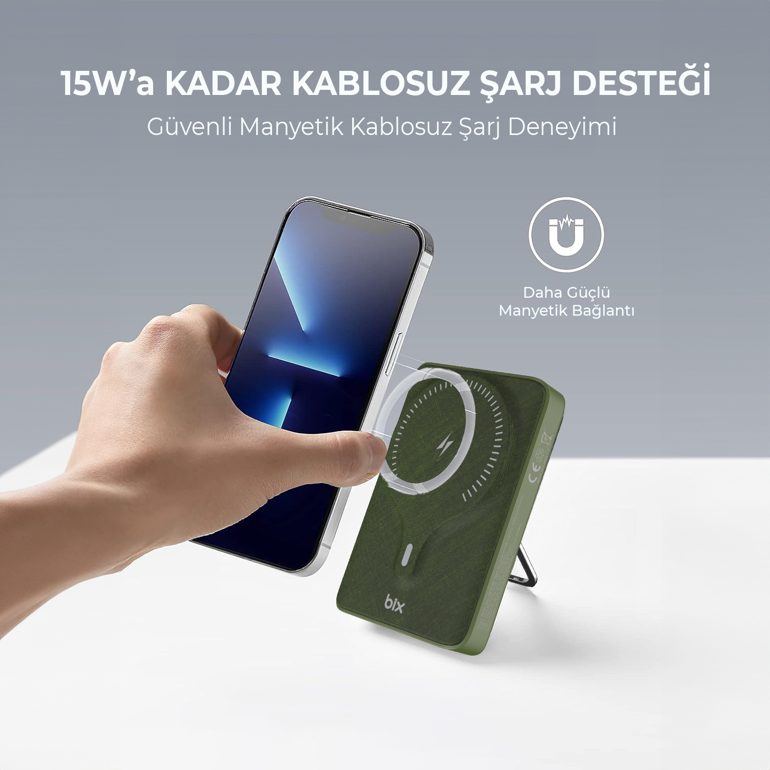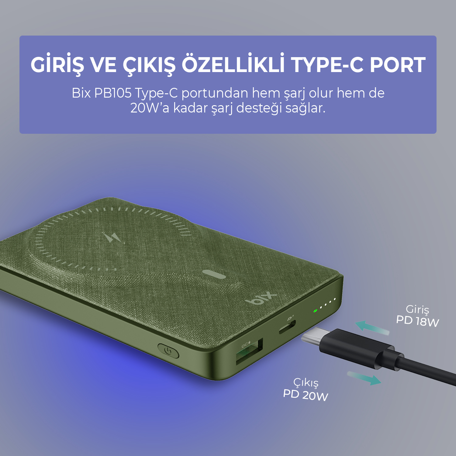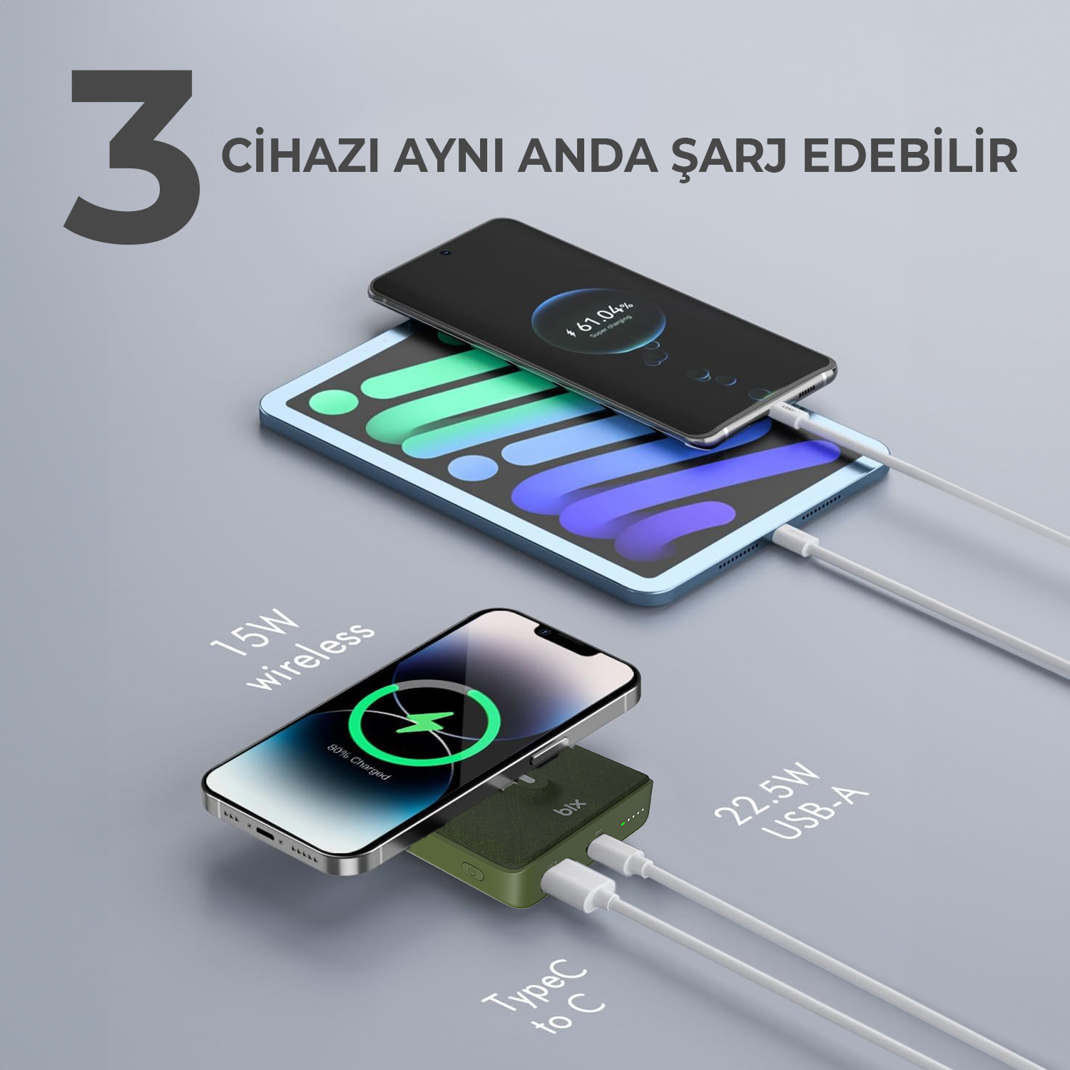 BİX 10000mAh BXPB105-GRE 22.5W-15W Type-C Micro USB KABLOSUZ LED GÖSTERGELİ Yeşil POWERBANK